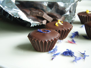 Lasin siis määritud vormidel viis minutikest sügavkülmas olla ning seejärel täitsin seguga. Panin vormid triiki täis ning katsin pintsli abil šokolaadiga. Ning kaunistasin ka. Kasutasin selleks ebaküdoonia koorest tõmmatud ribasid ning kuivatatud rukkilille õielehti. Ja edasi rändasid kommikesed taas sügavkülma, kus neil kümmekond minutit puhata lasin.